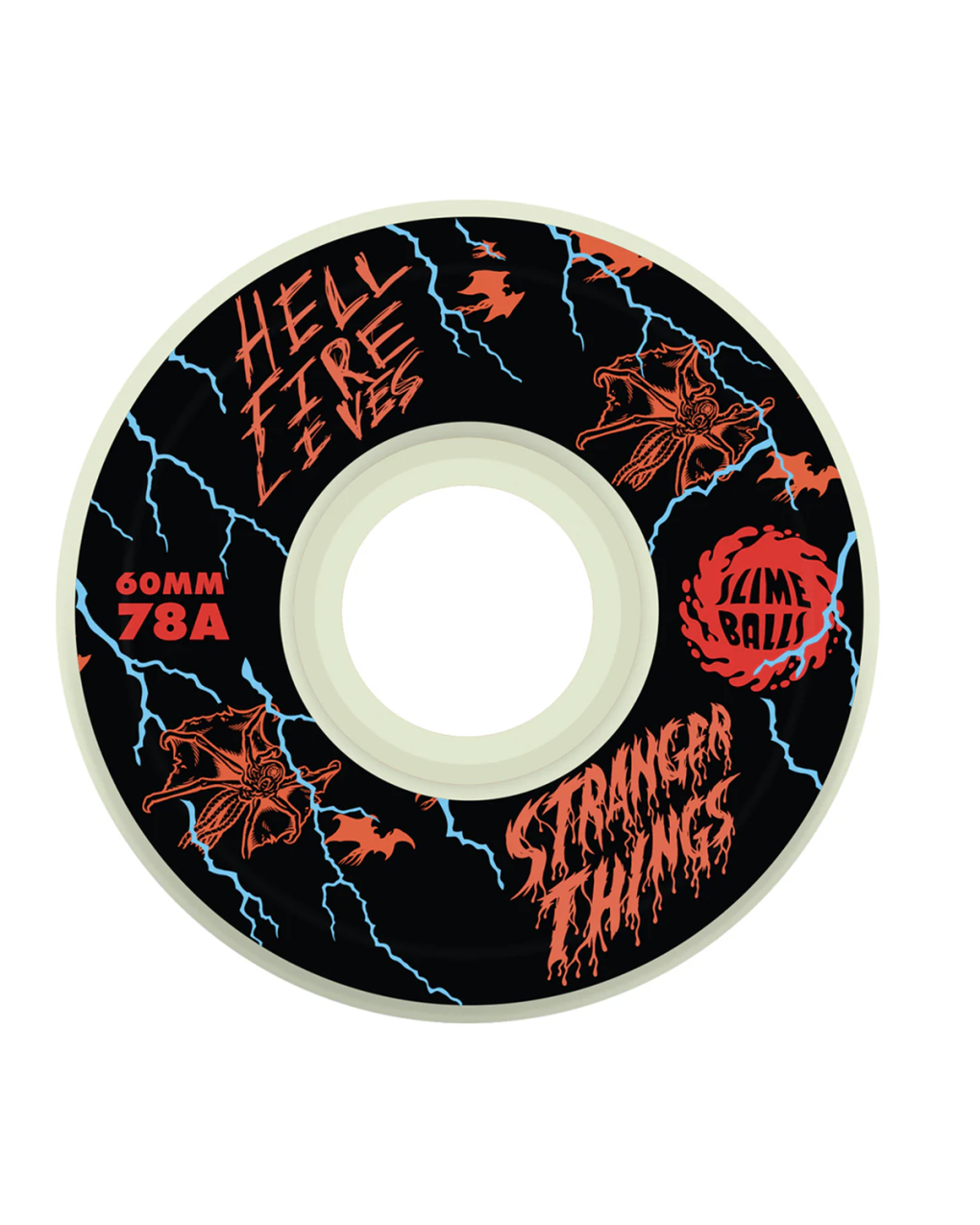The Slime Balls Stranger Things Meek Slasher Eddie OG Slime GITD 60mm, 78a wheels feature glow-in-the-dark urethane on Slime Balls OG Slime shape.