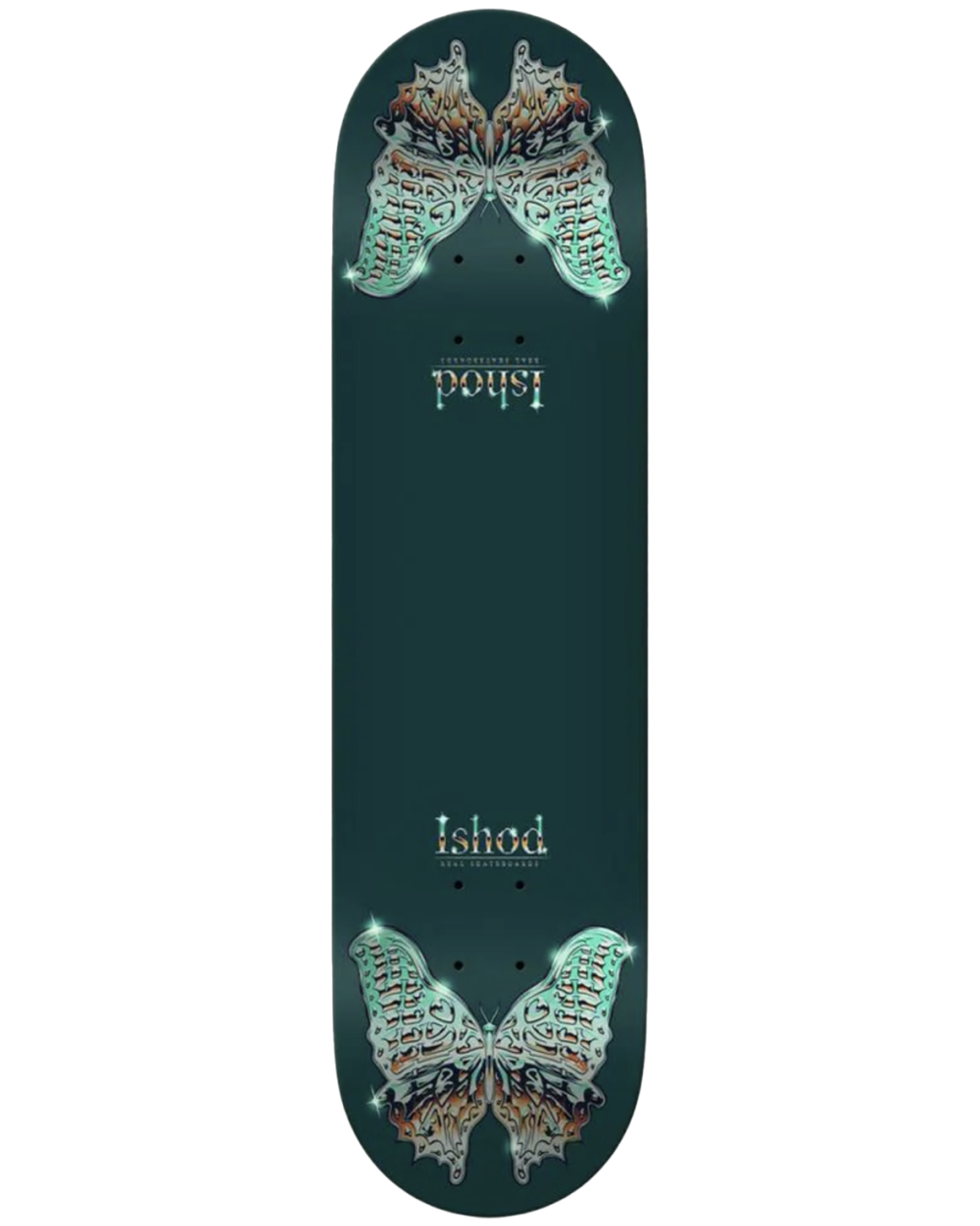 Deck measures 8.5" wide by 32.2" long with a 14.5" wheelbase featurings Ishods twin tail shape with identical 6.72" tails.